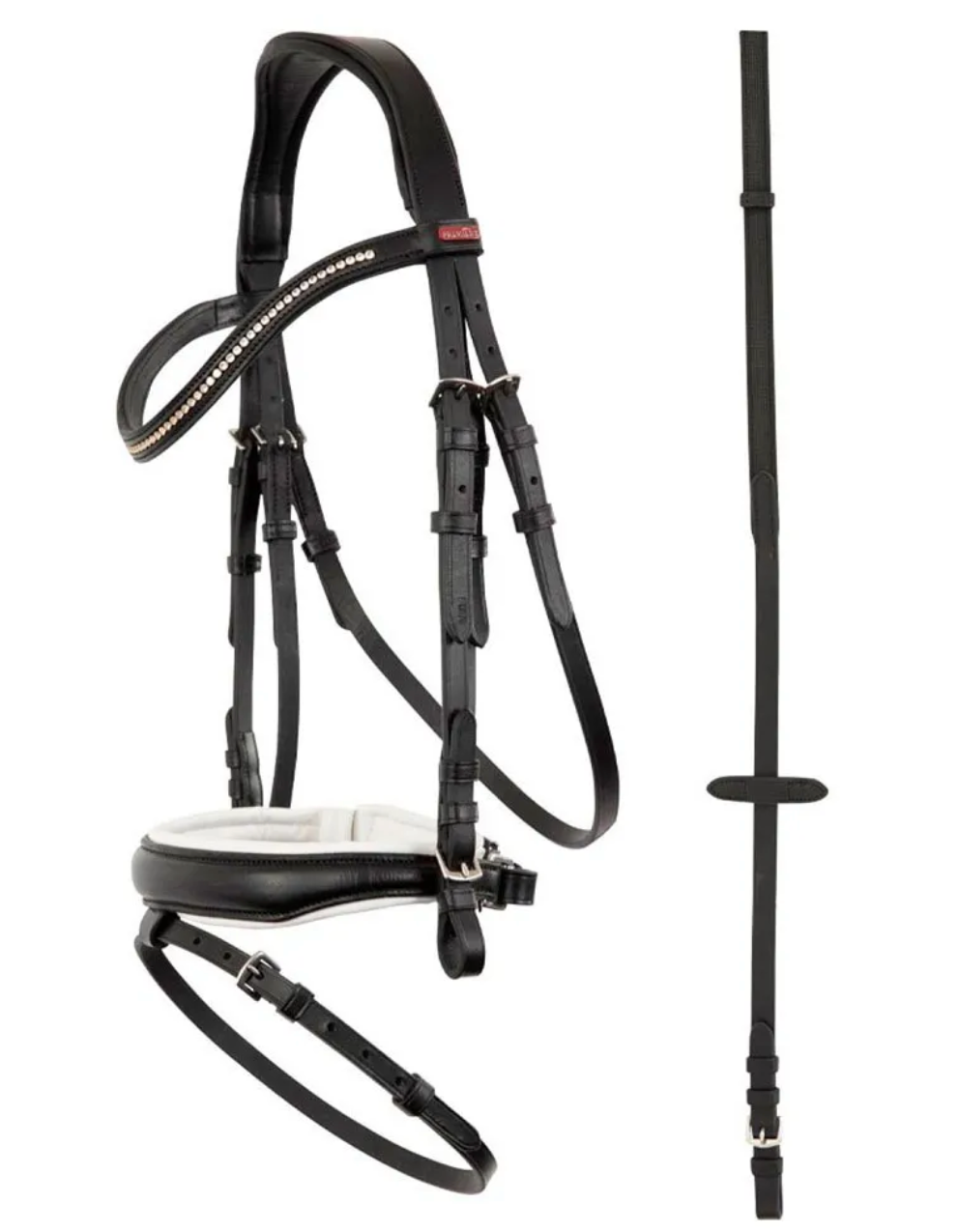 The Premiere Bridle Bastia is made of soft, flexible leather. The headpiece and noseband are anatomically shaped and softly lined. This ensures a good fit, a better pressure distribution at the horse’s head and a lot of comfort. The buckles of the noseband and flash strap have a protective flap. The throatlash can be adjusted on both sides. Includes: grip reins with hand stops.