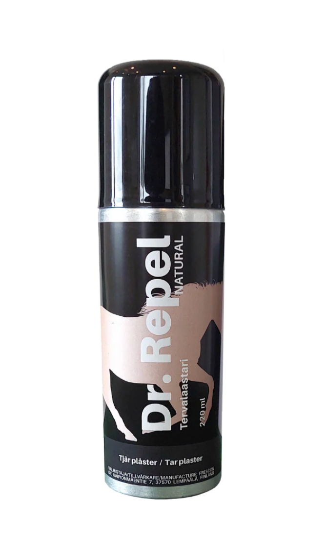 Dr. Repel Tar Plaster is an aerosol spray containing Finnish pine tar and resin designed to protect animal skin wounds, nicks, and scratches. It creates a quick-drying, transparent, and waterproof barrier that repels dirt and flies, while the active ingredients promote healing and offer antibacterial properties.