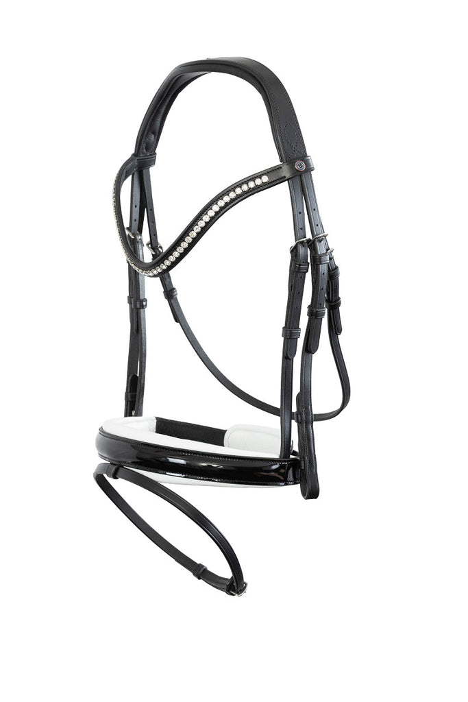TRUST Vancouver is an elegant bridle with a beautiful finish and fit. The bridle is characterised by the double leather noseband. The noseband padding extends beyond the noseband so that the buckles can never touch the horse's head. The front strap is fitted with the purest quality Stellux stones which provides an elegant look. These stones are deep-set, so they do not fall out. The headpiece is anatomically shaped and cut back for more freedom at the ears. The padding of the headpiece is soft but not too thick, ensuring direct contact with the horse. The TRUST Vancouver is a must-have bridle for the dressage rider.